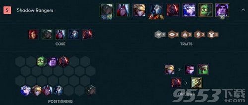 游侠阵容终于在9.24崭露头角,在4个游侠主力输出当中千珏同时兼具影、地狱火和游侠三大羁绊,凭借着超强的输出能力与灵活性成为阵容核心、另外新英雄赛娜也被添加进这套阵容当中组成了3影,由于卢锡安不是主力输出所以就没有带上他了。