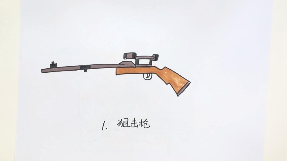 步骤1、画出枪管,画上它的装饰、扳机和望远镜;
