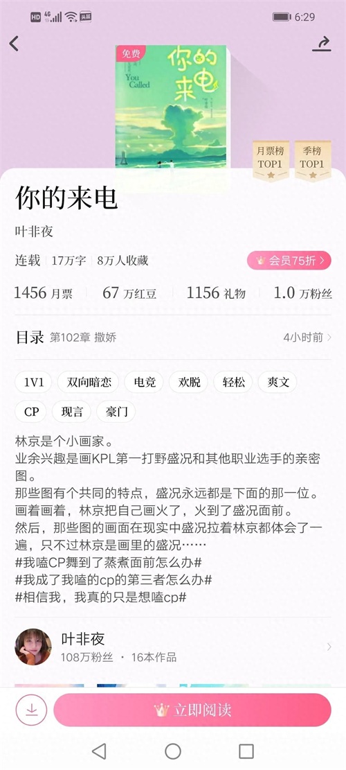 《你的来电》沿续了叶非夜前两篇文的双向甜宠故事情节,文风欢脱轻松,喜欢甜蜜蜜文章的可去红袖添香网站一观。