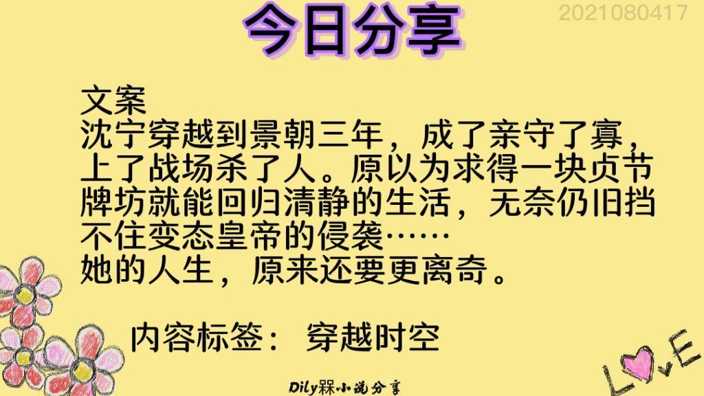 女主沈宁现代军人穿越到景朝三年,成了亲守了寡,上了战场杀了人,还因此阴差阳错遇上了皇帝——男主东聿衡,以为向他求了一块贞节牌坊就可以高枕无忧,没想到居然还是被出尔反尔丧心病狂的皇帝纳入后宫。