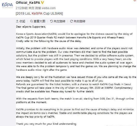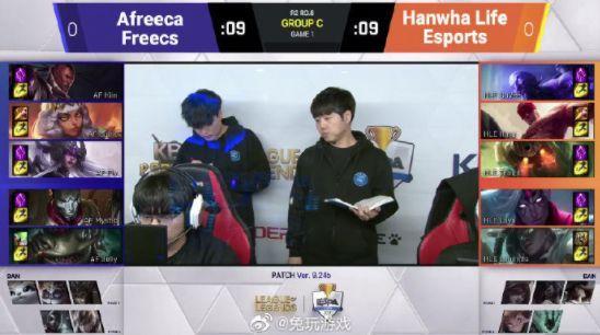 在八强淘汰赛的比赛中,下午16点的第一场比赛SB和HLE的BO3结束之后,按理说GRF和AFs的比赛应该在北京时间晚上7点开赛的,但因为耳机设备出了问题,导致比赛暂停。