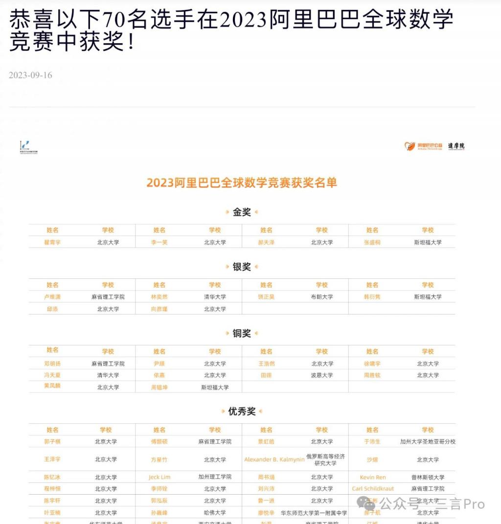 阿里达摩院官网上,已经公布了 2021 年至 2023 年间,历次数学竞赛最终获奖名单。其中,2021 年 70 名获奖名单于 2021 年 9 月 24 日公布;2022 年 77 名选手获奖名单于 2022 年 9 月 26 日公布;2023 年 70 名选手获奖名单于 2023 年 9 月 16 日公布。