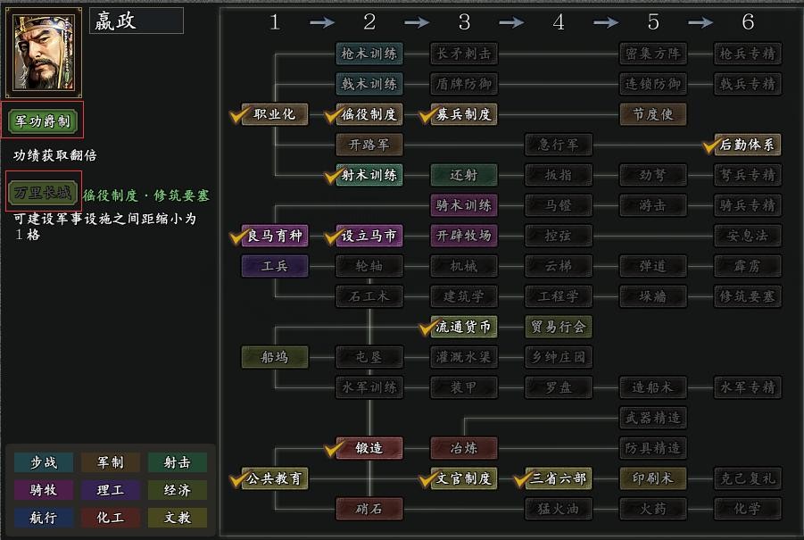 大秦势力还有两个专属科技分别是军功爵制和万里长城。军功爵制可以让势力武将获取功绩的效果翻倍,这个科技明显又让大秦前期的实力大增,因为这会让大秦的武将更快解锁高级特技形成对周围势力的压制。