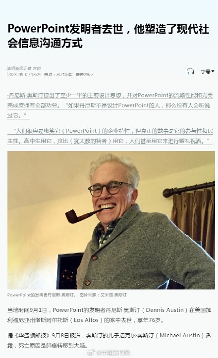 当地时间9月1日,PowerPoint的发明者丹尼斯·奥斯汀(Dennis Austin)在美国加利福尼亚州洛斯阿尔托斯(Los Altos)的家中去世,享年76岁。据《华盛顿邮报》9月8日报道,奥斯汀的儿子迈克尔·奥斯汀(Michael Austin)透露,死亡原因是肺癌转移到大脑。(澎湃新闻)