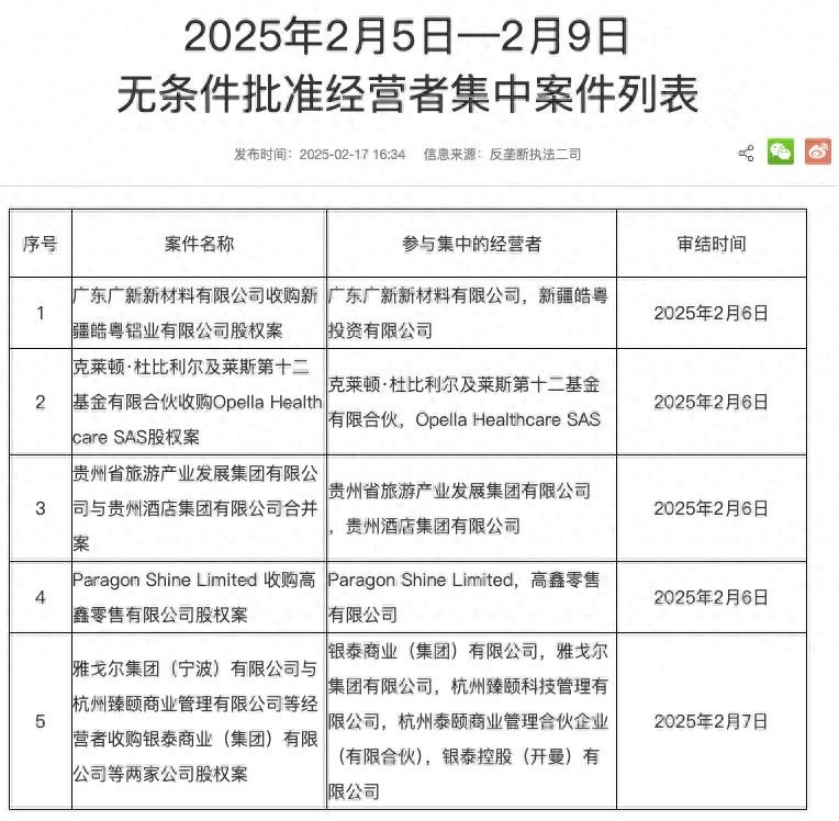 市场监督管理总局公布2025年2月5日—2月9日无条件批准经营者集中案件,其中雅戈尔集团(宁波)有限公司与杭州臻颐商业管理有限公司等经营者收购银泰商业(集团)有限公司等两家公司股权案获批。