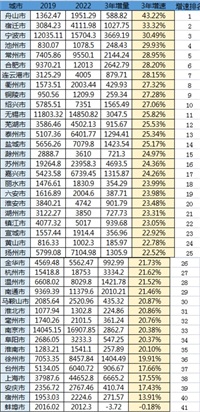 而且按照舟山目前的投资强度,舟山大概率未来5年依然会保持翻番的增长态势;排名第二的是宿迁,3年时间增长了1/3,如果说别人是失去的3年,宿迁则是跑步前进的3年;排名第三的是宁波,宁波作为一个万亿经济体量的城市,3年增长了30.49%,可以说是闷声发大财的典型。
