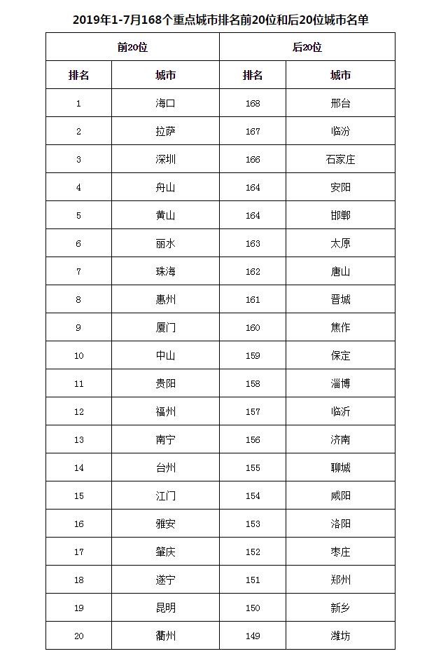2019年1-7月,168个重点城市中邢台、临汾、石家庄、安阳、邯郸、太原、唐山、晋城、焦作、保定、淄博、临沂、济南、聊城、咸阳、洛阳、枣庄、郑州、新乡、潍坊空气质量相对较差(从第168名到第149名)。