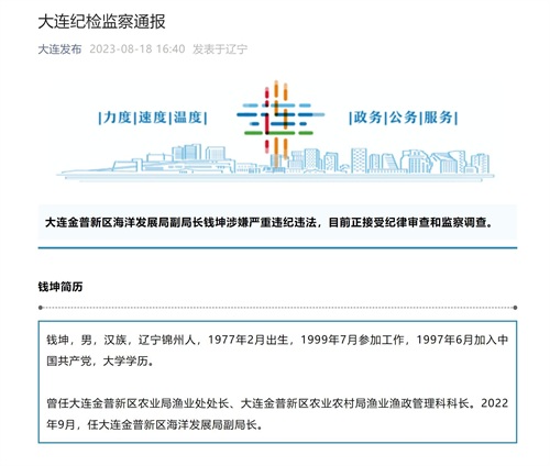 大连金普新区海洋发展局副局长钱坤涉接受审查调查