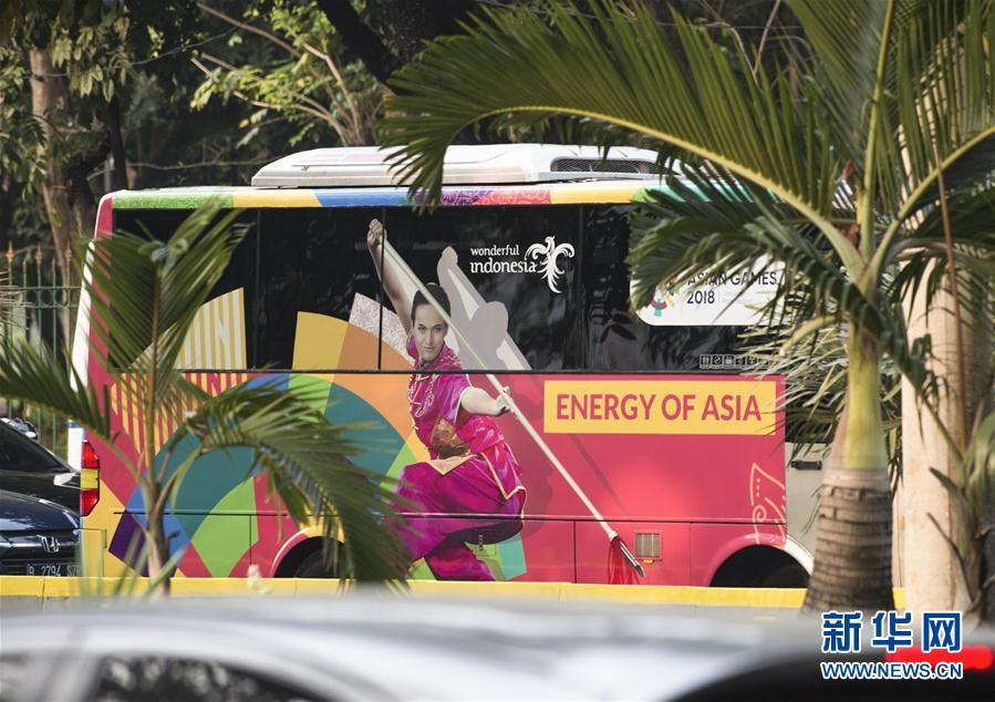 图为8月14日,一辆绘有亚运图案的公交车行驶在雅加达街头。 新华社记者杜宇摄
