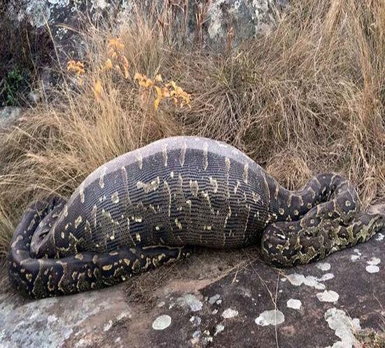 超长身长的巨蟒在吞下食物后仍然张着大嘴,着实吓人。