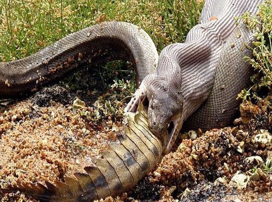 这是一条巨胖在吞食鳄鱼,脸鳄鱼都能给一口吞下,还有什么是它不能吃的。
