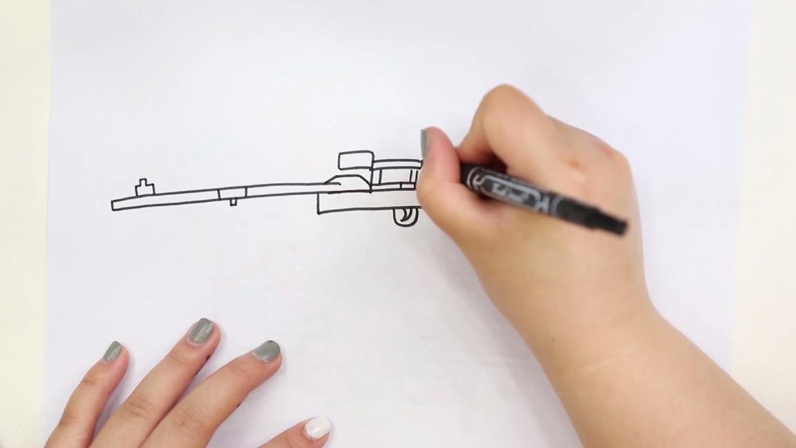 步骤1、画出枪管,画上它的装饰、扳机和望远镜;