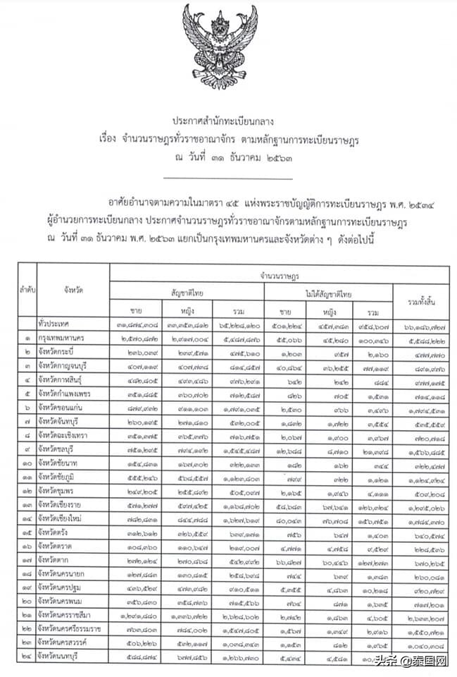 泰国网报道,据泰媒经理人报消息,日前泰国内政部公布了泰国民事登记相关数据。截至2020年12月31日,泰国民事登记人口为66186727,包括65228120名泰国公民(31874308名男性、33353812名女性)和958607名非泰国公民(501224名男性,457383名女性)。截至2019年12月31日,泰国民事登记人口为66558935,包括65614157泰国公民(32110775男性、33503382女性)和944778名非泰国公民(494325名男性、450453民女性)。