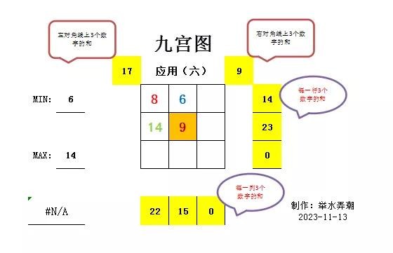 从九宫图应用(六)中可以看出,每一行、每一列、左右对角线上三个数字的和都是27;而且没有一个数字是重复的。