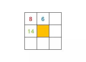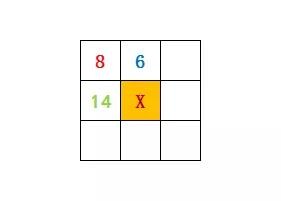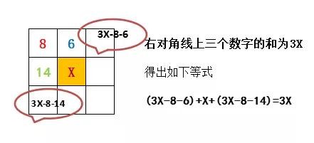 右对角线上三个数字的和是3×,得出如下等式(3×-8-6)+×+(3×-8-14)=3×;