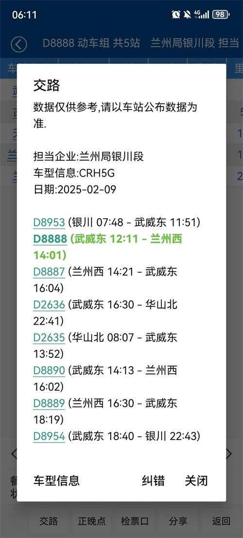 本次旅客列车从武威东站始发途经古浪北站、天祝西站和兰州新区站最终到达兰州西站,担当客运业务的是兰州铁路局银川客运段,列车运行在甘肃省境内,经由兰张二线线路兰武段运行,用时1小时50分钟,