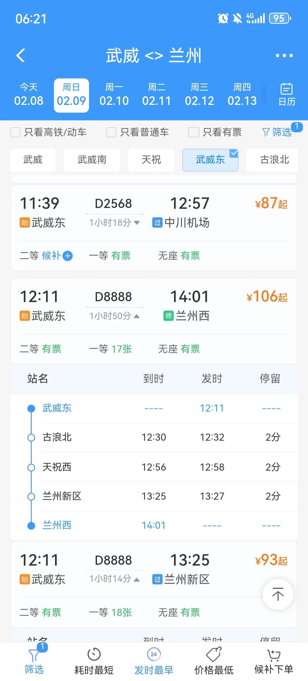 本次旅客列车中午12:11从武威东站始发,12:30抵达古浪北,古浪县,甘肃省武威市辖县,位于甘肃省中部、武威市东部,地处河西走廊东端,属祁连山高寒亚干旱区和河西冷温带干旱区气候,干旱少雨。12:56抵达天祝西,天祝县地处河西走廊东端,属青藏高原东北边缘,素有河西走廊“门户”之称。13:25抵达兰州新区,14:01抵达兰州西。