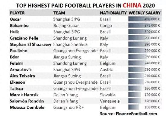 近日,网站《financefootball》发布了2020中超工资最高的15名球员工资排行榜。在这份榜单中全部是外援,上港有3名球员入选,恒大同样有有3名球员入围。奥斯卡的周薪为45万欧元,每天的收入大约是50万元人民币。而国安前锋巴坎布的周薪为37.5万欧元,接近2000万欧元的年薪,让其成为非洲收入最高的足球运动员。排名第三的是上港前锋胡尔克的32万欧元,排名第四的是山东鲁能的佩莱和申花的沙拉维,周薪都是高达29万欧元。
