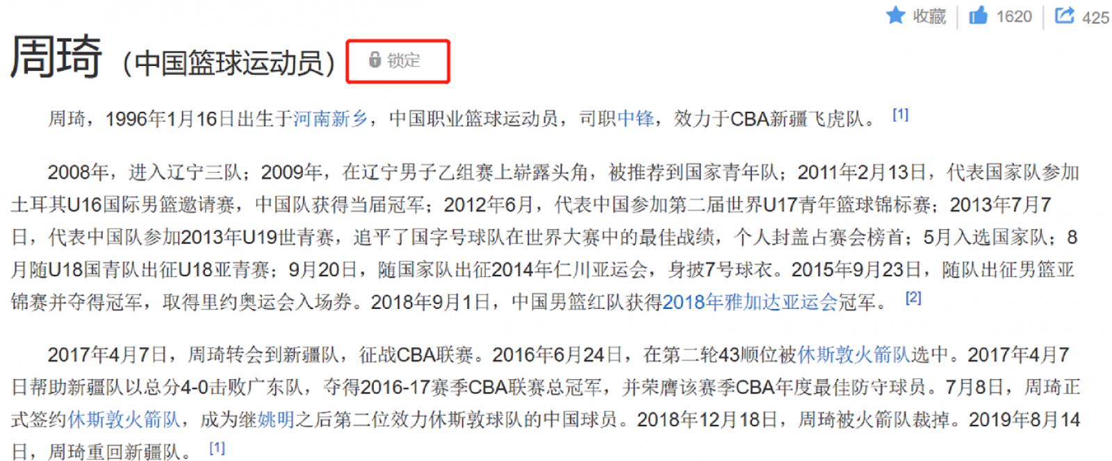 周琦百科词条被篡改,官方已将其词条锁定