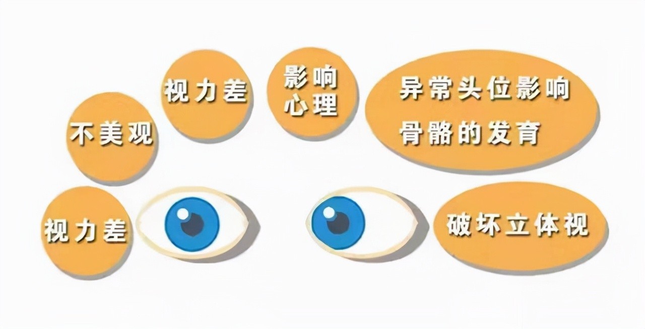斜视一眼可见,严重影响美观,难免给孩子的心理健康蒙上阴影,从而造成其孤僻、自卑及反常的心理。甚至会影响其长大后正常的工作和社交。重要的是会对视觉功能产生损坏,尤其是单眼斜视和内斜视。这种情况往往会引起弱视,若不及时治疗,患儿的视力一生将不能提高。斜视会导致颈部发育畸形临床上有一种斜视叫麻痹性斜视,这种斜视的患儿,由于眼肌麻痹,看东西有重影,为克服重影,习惯采用偏头、侧脸、抬颏等特殊头位来补偿,医学上称“代偿头位”。时间久了,会导致颈部骨骼发育异常。