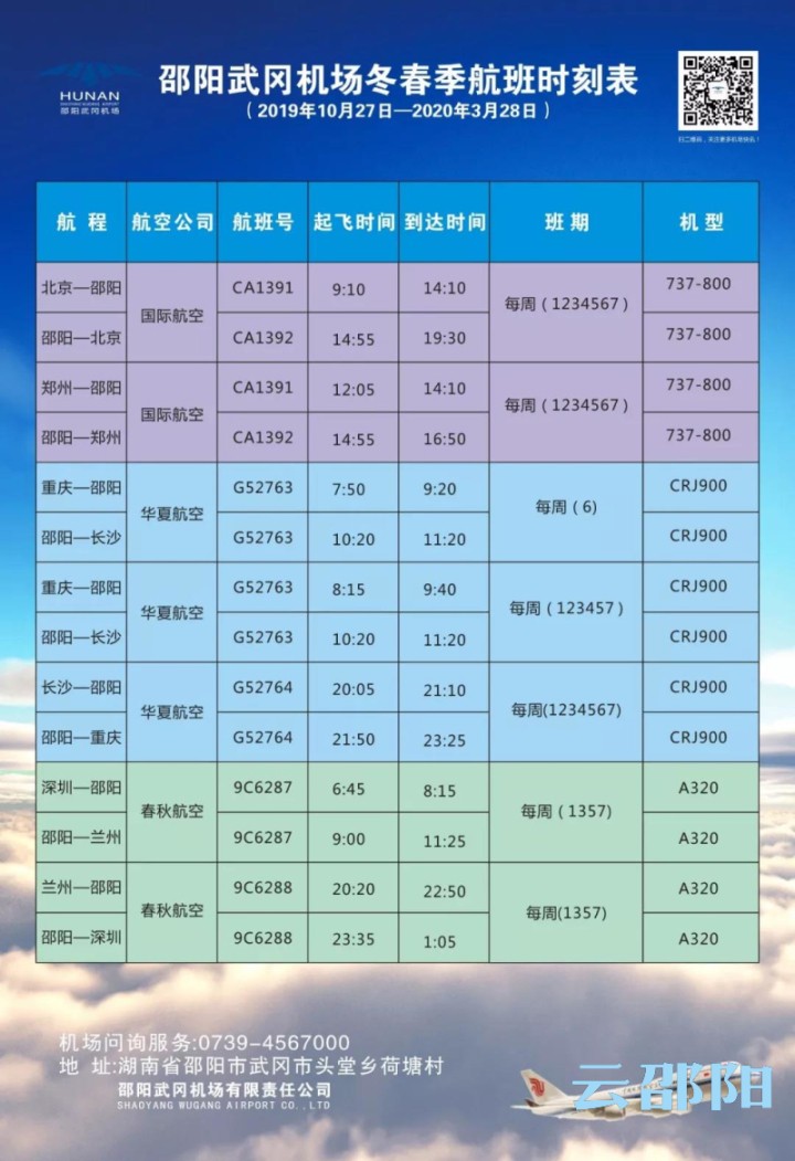 云邵阳客户端10月24日讯(全媒体记者 刘波 通讯员 刘倩)10月24日,邵阳武冈机场发布消息,10月27日起,邵阳武冈机场正式启用冬春季航班运行时刻表,届时部分航线时刻、班线有较大变化,提醒市民留意。