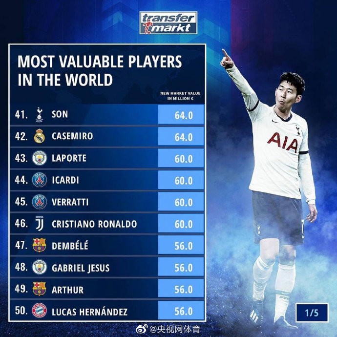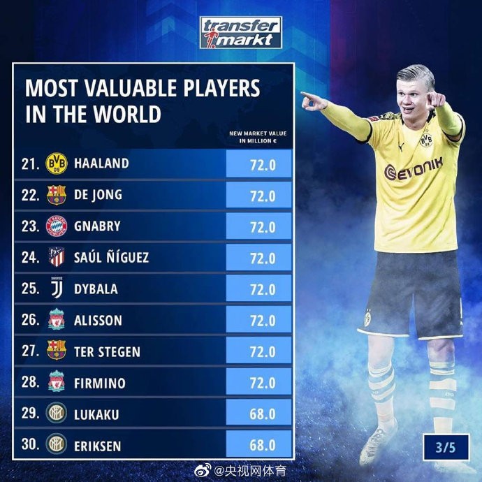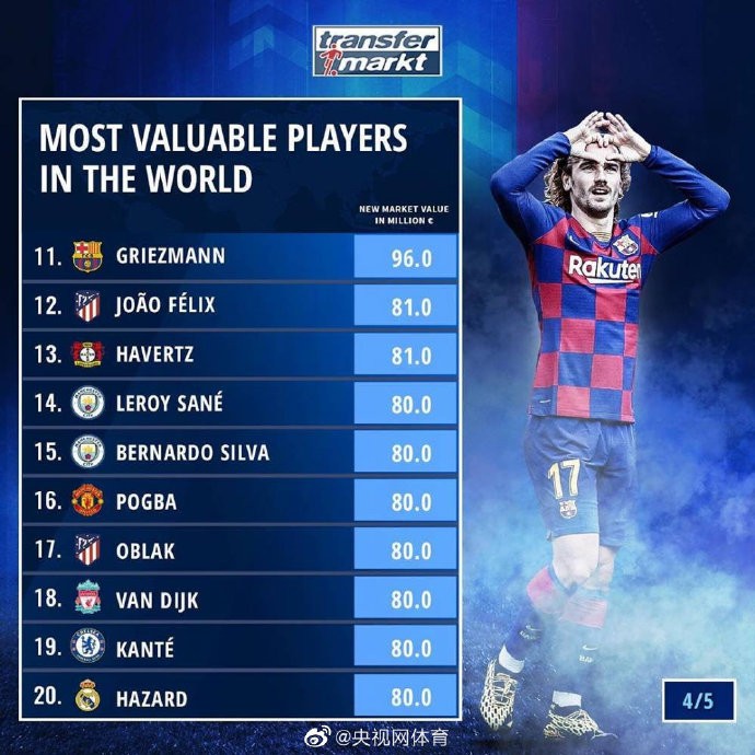 球员身价榜Top50:姆巴佩居首 梅西第九