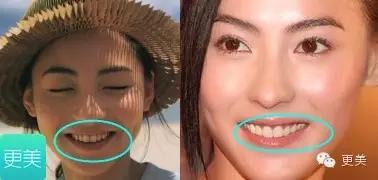以前的范冰冰牙齿有点乱,两颗门牙略大略突出。现在的她则是一口糯米小白牙,晶莹剔透的。
