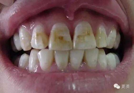 氟斑牙:虽然经常听到含氟牙膏能有效防治龋齿,但摄入过量的氟会使牙齿产生一些斑点,严重时可使牙齿变黄,表面粗糙,容易缺损。还有一些地区饮用水含氟较高,也容易导致。
