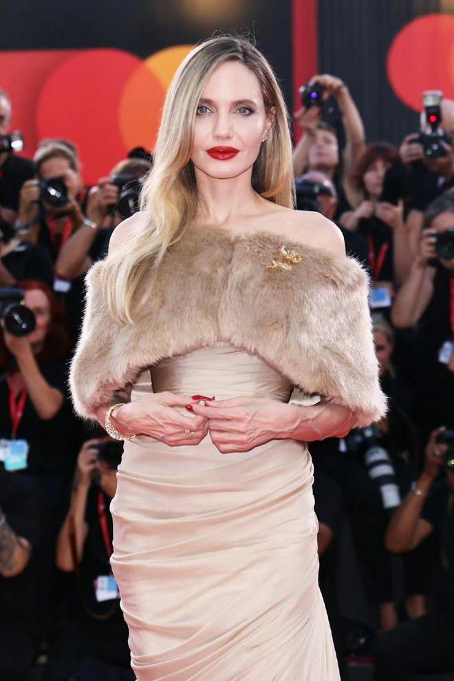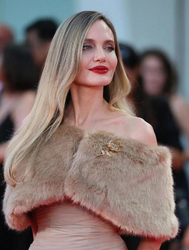 出席《玛利亚》在威尼斯电影节上的首映礼,朱莉显得雍容华贵,仪态万千,虽然岁月的痕迹还是给她美丽的容颜留下了痕迹,但她还是璀璨夺目的。