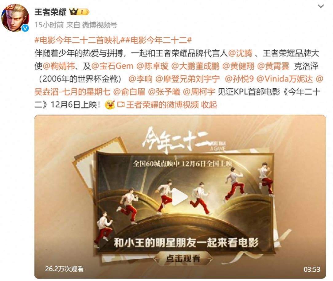 【环球网科技综合报道】 12月4日消息,《王者荣耀》在社交平台宣布,其职业联赛(KPL)的首部纪录电影《今年二十二》将于12月6日全国上映,目前全国60城已开启点映活动。