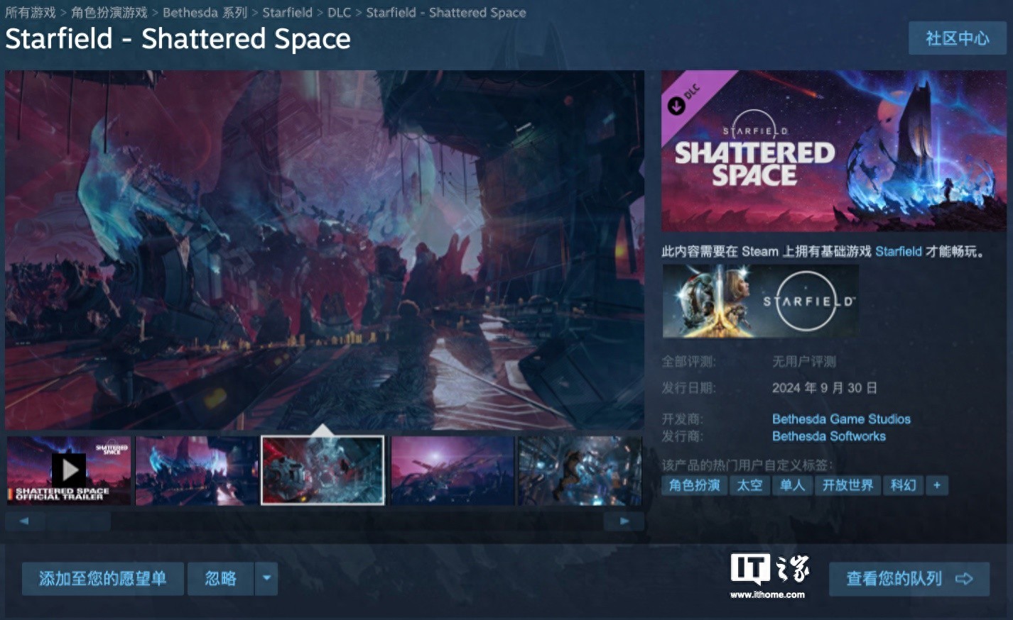 IT之家 9 月 28 日消息,B 社《星空》首个 DLC“破碎空间”(Shattered Space)将于北京时间 9 月 30 日晚上 11 点解锁,这款 DLC 在 Steam 平台国区预购售价为 116 元,IT之家附游戏商品页如下(点此访问)。