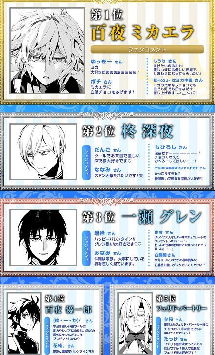 《终结的炽天使》白色情人节人气投票结果公布