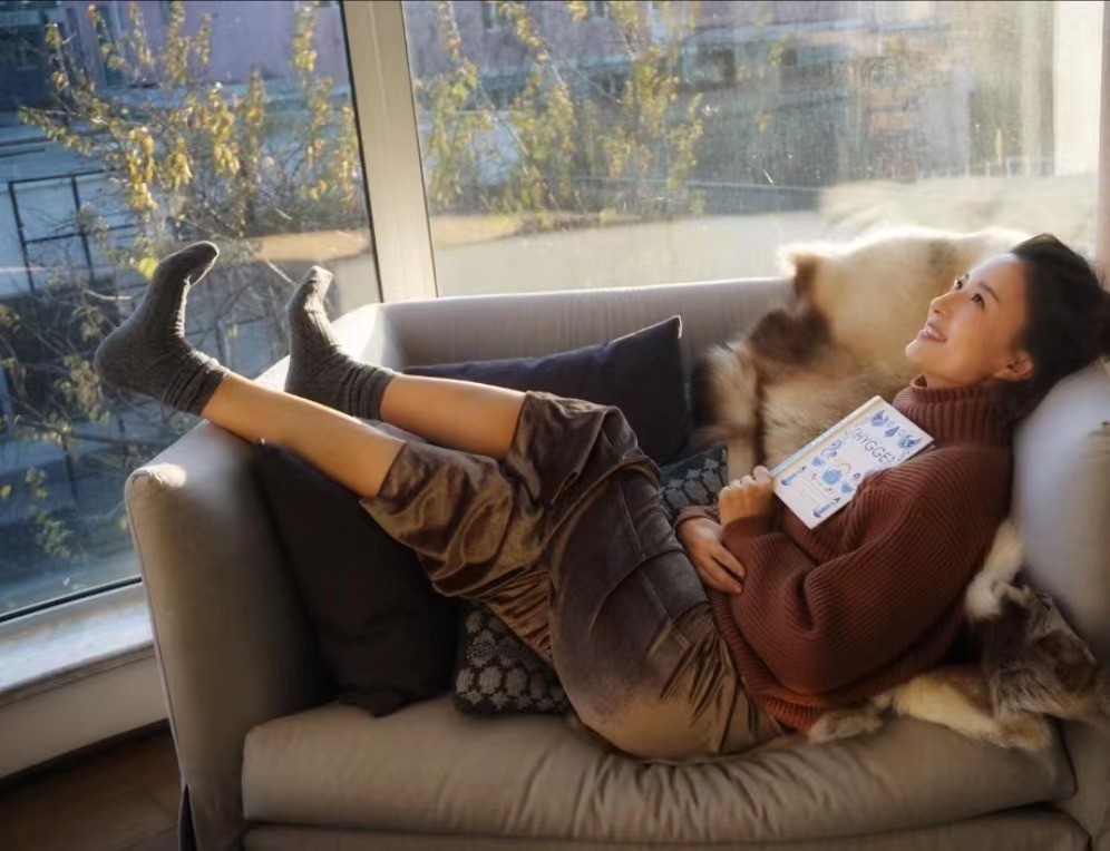 她手拿一本书,斜躺在沙发上,午后的阳光暖暖地照在身上。