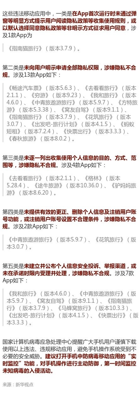 【这17款APP,可能正在偷窥你的隐私!】关注国家计算机病毒应急处理中心近期在“净网2020”专项行动中通过互联网监测发现,多款旅行类移动应用存在隐私不合规行为,违反《网络安全法》相关规定,涉嫌超范围采集个人隐私信息。详见 via 新华社
