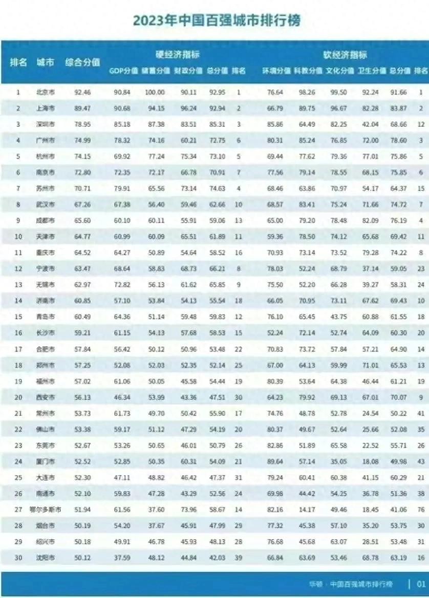 2023国内百强城市排名情况,天津跻身前十,重庆第十一,武汉深圳