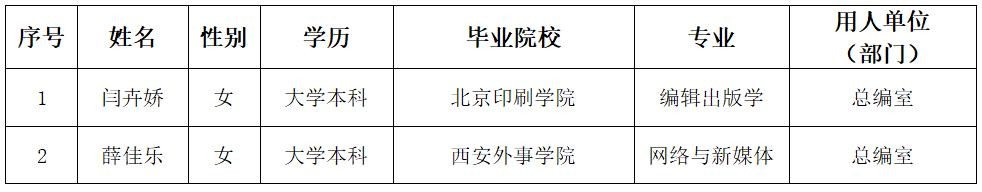 经公开招聘,拟录用以下2人为报社聘用人员,现将拟录用人员信息公示如下: