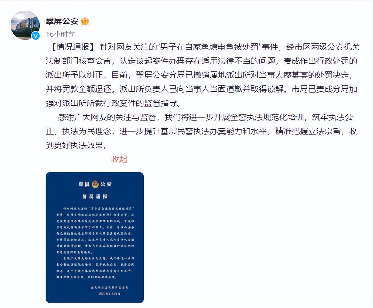 四川一男子在自家鱼塘电鱼被罚500元 警方撤销处罚并道歉
