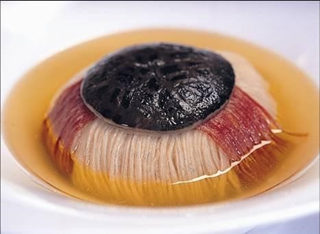 制作要领:取熟猪肉125克,熟火腿肉30克,熟鸡脯肉10克,熟笋丝30克,分别切成5厘米长的细丝,用一只水发冬菇去蒂洗净后,黑润的一面紧扣小碗底的中心:火腿丝分成三份,整齐地成三角排在碗边:鸡丝分成两份与笋丝一份分别排在火腿丝旁边成六等份,然后用肉丝垫在中间,垫实,撒上精盐,浇些肉清汤,上笼用旺火蒸上15分钟左右,翻扣在大汤盘;再用肉清汤烧沸,撇去浮沫,加些精盐,淋少许熟猪油,倒入揭去扣碗的汤盘即成。
