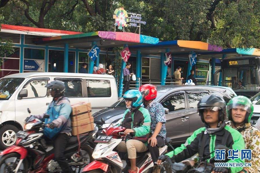 图为8月14日,在雅加达街头,繁忙的车流经过装饰成亚运风格的公交车站。 新华社记者杜宇摄