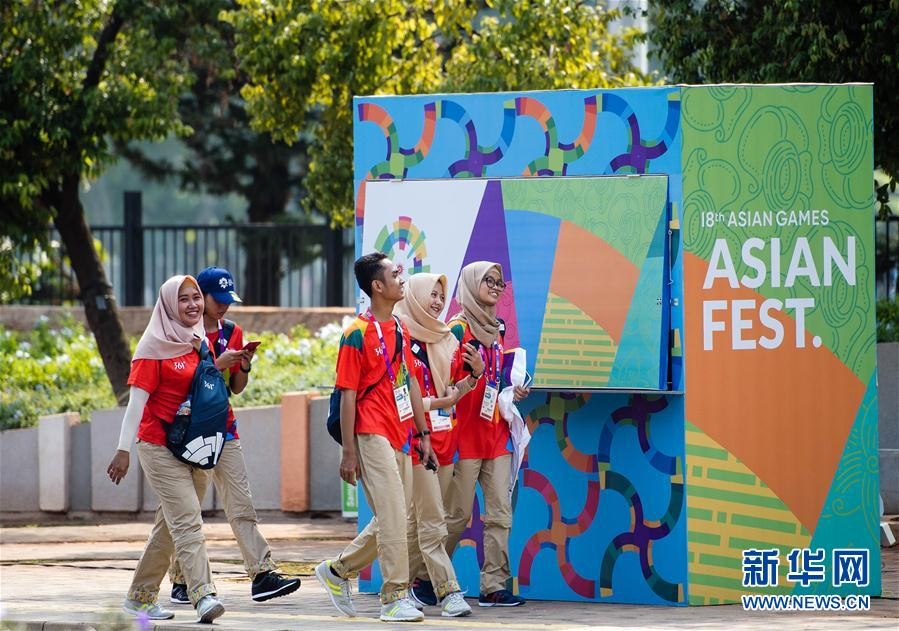 图为8月16日,几名亚运会志愿者走过雅加达街头。 新华社记者李响摄