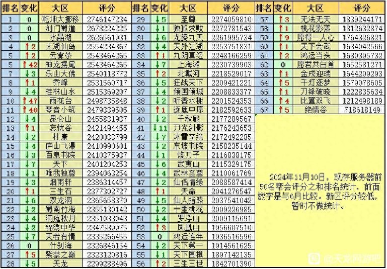 如今有老玩家根据每个服务器前50名帮派综合实力对老服务器进行了综合排名,得出结论惊人:如今的全服第一服务器是曾经创造了争霸赛三连冠奇迹的【乾坤大挪移】。