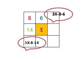 右对角线上三个数字的和是3×,得出如下等式(3×-8-6)+×+(3×-8-14)=3×;