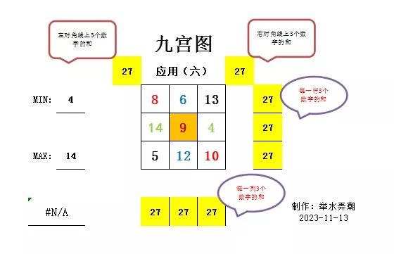 从九宫图应用(六)中可以看出,每一行、每一列、左右对角线上三个数字的和都是27;而且没有一个数字是重复的。