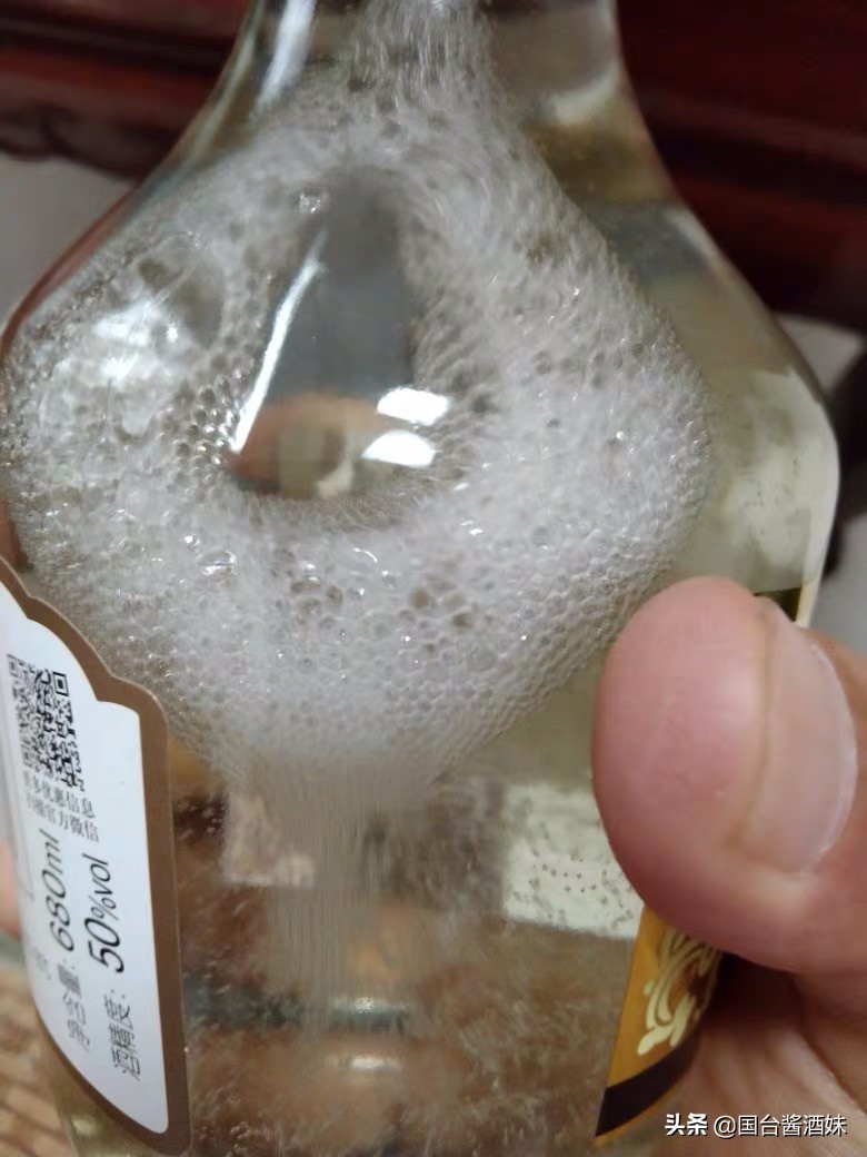 酒液清澈没有杂质,呈现微黄色,有挂杯,但不是很明显,酒液算比较粘稠,摇晃酒瓶酒花丰富细腻,消散速度中等。