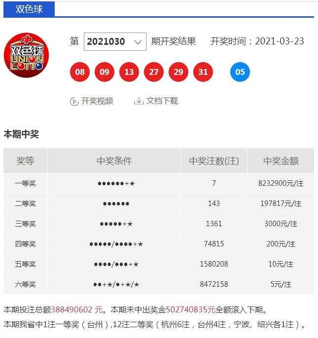 847万!昨晚双色球幸运又降临我省。3月23日,双色球第2021030期开奖,全国共中出7注一等奖,单注奖金823万元。台州一彩民幸运击中1注一等奖,1注二等奖,总计中得847万元。