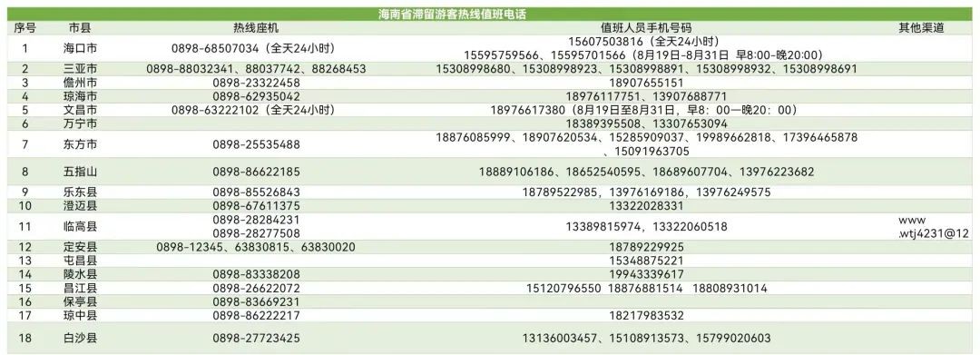 8月19日,海南省旅游和文化广电体育厅发布最新的各市县滞留旅客24小时热线电话。据悉,为保障因新冠肺炎疫情滞留旅客有序返程,海南省有关部门及市县政府将按照分类施策、分批转运、安全有序、严防外溢的原则,成立游客返程服务专班,制定转运具体实施方案,自8月9日从三亚开始,按计划安排旅客有序离岛。具体事宜可向各市县旅文部门进行咨询。