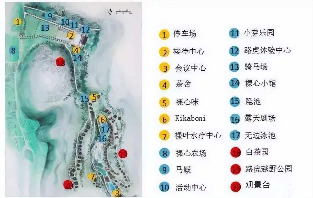 同时五个大的功能分区由 20 多个小节点构成, 有茶舍、 骑马场、 裸心小馆、 会议中心等 ( 见图 6) 。这些景观点从不同的方面为各个年龄阶层、有各种消费需求的游客提供选择, 其核心理念都是为游客提供丰富的游玩与休闲体验。节点之间通过建筑与自 然的衔接, 构成一个大的景观空间。让游客步移景异, 每到一处都有新发现与新乐趣。
