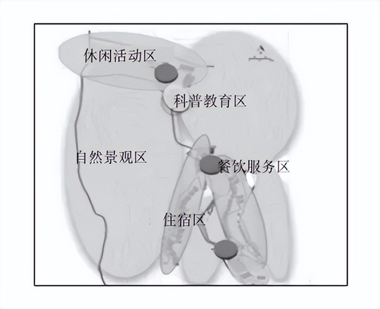 目 前, “ 裸心谷” 度假村将整个区域分为五大功能区 ( 见图 5) 。除了住宿区域外, 还包括自 然景观、 休闲活动、 餐饮服务、 科普教育四大区块。每个区块有着自 己的主题定义与功能, 各个区域既相互区别又相互联系。在休闲活动区与自 然景观区, 游客们可以自 由 地与大自 然亲密接触,使精神获得极大地放松。科普教育区则适合一家人亲子游览, 沟通感情,寓教于乐。