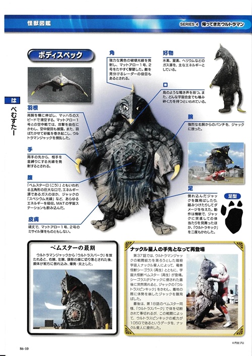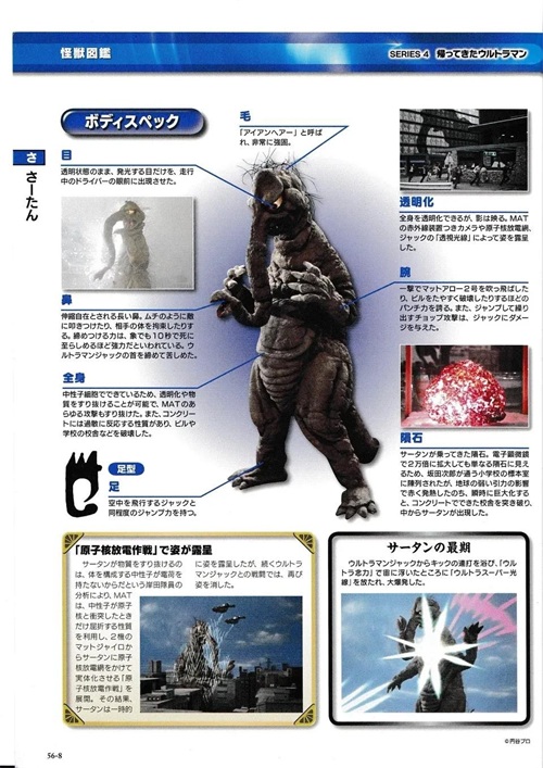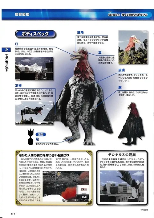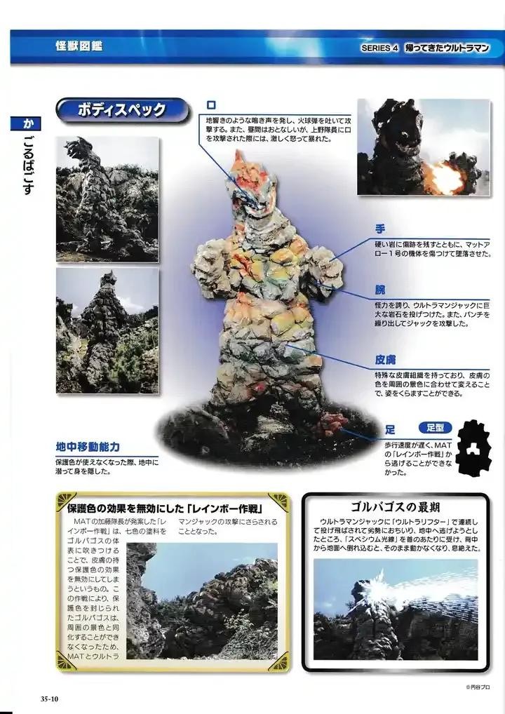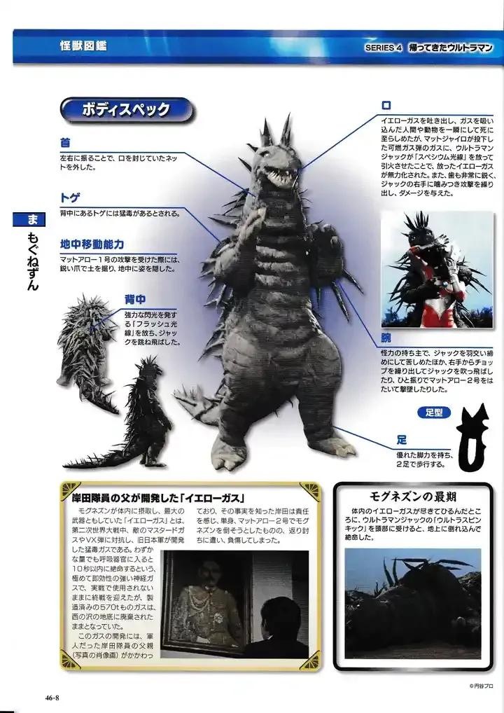吞食了旧日军制造的毒气弹的怪兽,能从口中吐出黄色的猛毒性气体,能让生物瞬间死亡,就连MAT的防毒面具也没用;甚至是杰克奥特曼在战斗中也被毒气影响,最后被杰克奥特曼和MAT的联合攻击打倒。