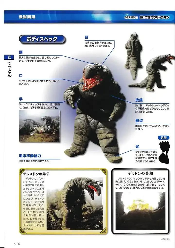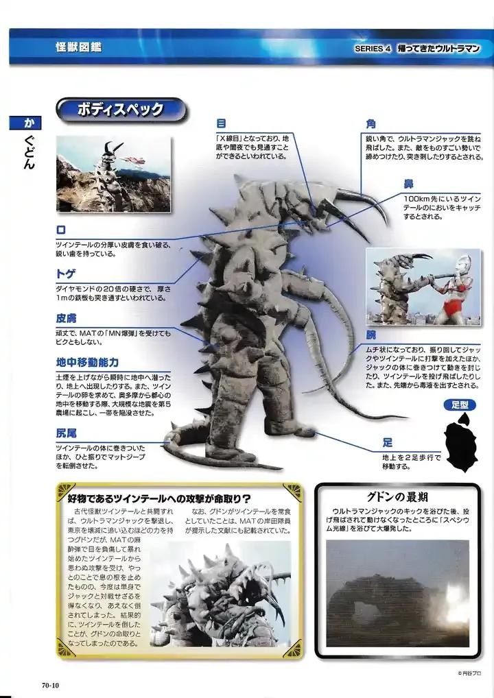 MAT队的文献中留有记录的肉食大怪兽,为了吃掉双尾怪的蛋而出现在地面,导致东京二号采石场发生地震,双尾怪的天敌,双手为强有力的鞭子,表皮十分坚硬,普通火炮攻击完全无效,MAT针对其研究的MN炸弹攻击也无法对古敦造成任何伤害,鞭子状的双手强劲有力。MAT的上级曾经打算使用威力接近小型氢弹的最后王牌-spiner牺牲东京来对付古敦。和双尾怪夹击一度打倒了杰克,第二次战斗中将冲撞自己的双尾怪咬死,之后和杰克奥特曼单挑,被杰克用过肩摔摔晕后,再用斯派修姆光线将其击杀。